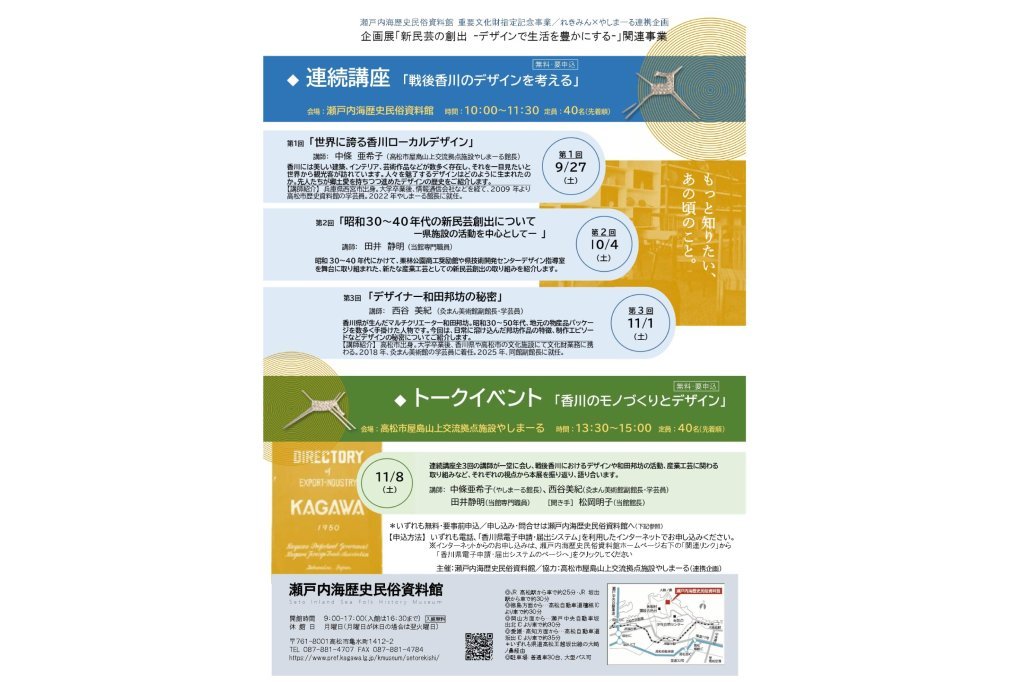 イベント内容 | 報告 「瀬戸内海歴史民俗資料館の活動の現状 -時代・社会の変化のなかで-」 田井静明 (瀬戸内海歴史民俗資料館専門職員) 講演 「美大発!民具“楽”の提唱 -民具=「生活の造形アーカイブ」の活かしかた-」 加藤幸治氏 (武蔵野美術大学教授) ※瀬戸内海歴史民俗資料館にて、講演会に関連した企画展「新民芸の創出」展を開催中 会期:~11月9日(日) 入場無料 |