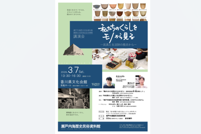 | イベント内容 | 講演1 「集められた民具からわかること‐日本各地の箕・籠を例にして‐」 今石みぎわ (東京文化財研究所主任研究員) 講演2 「中田静さんの残した生活財からわかること」 横川公子 (武庫川女子大学附属総合ミュージアム館長) 報告 「瀬戸内海歴史民俗資料館の資料収集、これまでとこれから」 田井静明 (瀬戸内海歴史民俗資料館専門職員) トークセッション 今石みぎわ、横川公子、田井静明 司会 : 松岡明子(瀬戸内海歴史民俗資料館館長) 場 所 香川県文化会館 芸能ホール 定 員 230名(先着順・定員になり次第、終了) 申込受付中! 申し込みは、電話・「香川県電子申請・届出システム」を利用したインターネットから ※インターネットからのお申し込みは、瀬戸内海歴史民俗資料館ホームページ右下の「関連リンク」から「香川県電子申請・届出システムのページへ」をクリックしてください。 |
