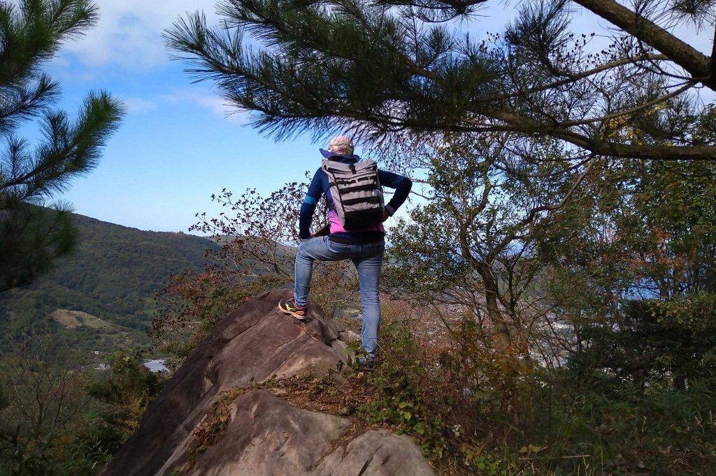鬼無駅からみかん畑のひろがるのどかな里山のあとに出てくる山道にはいってからが、このコースの醍醐味。山は、ときどきなだらかになったり険しくなったりし、最後に念を押すようにぎゅんと厳しい坂がありますが、登りぬいた先には、戦国の城「勝賀城」の主郭がひろがり、囲まれた土塁の向こうには、高松が四方見渡せます。